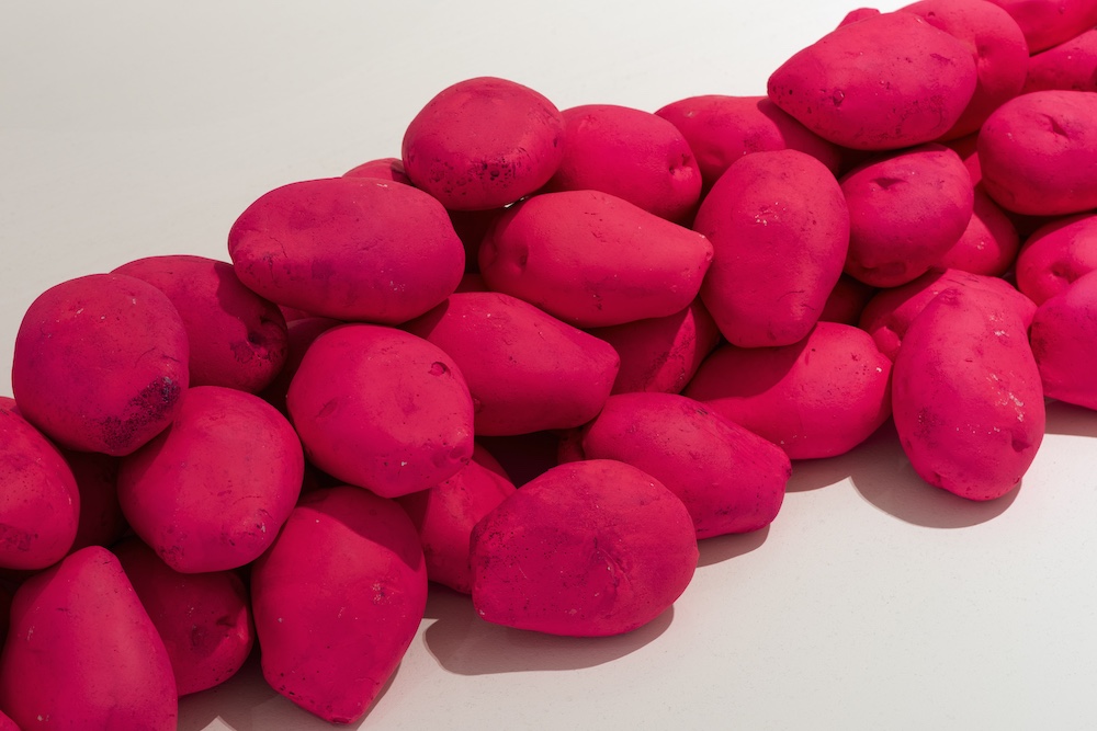 The proliferation and control of nature is explored in ‘Pink Rot’, an installation of identically cast potatoes. The title of the work refers to the pink rot potato disease which is endemic in soils where the crop is repeatedly grown. While genetic modifications may counter disease and increase yield, the impact of intensive farming on soil erosion and biodiversity is still held within the land. The potatoes of ‘Pink Rot’ are witness to this – alluringly pink, cloned immaculately, though heavy and dead. Using the language of minimalism and pop-art, Myfanwy creates an unsettling monument to our agro-ecologies.
