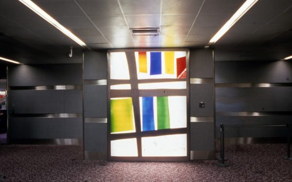 This commission being Blow’s only large scale experimentation with glass, forms an important part of the artist’s body of work. According to the artist herself: ‘Flight Structure is balanced to give the sense of a secure enclosure, whilst the luminous, coloured glass panels lift off into animation and gaiety,…with colours running across the top, taking off into flight.’