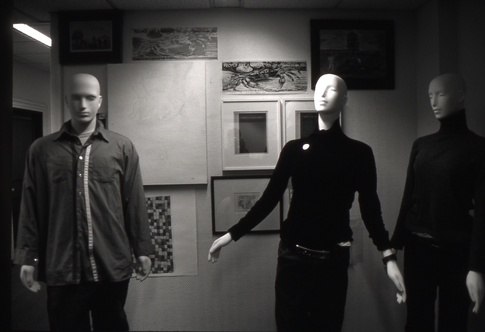 ’Cluedo’ is the result of a collaboration between Charlotte Cullinan, Jeanine Richards and Los Angeles based artist, Dave Muller. It is a mixed media, multi-layered, parodic installation of 3 mannequins from Marks & Spencer dressed in the artists’ clothes, set against a background of an installation of paintings and drawings of their own and other artists’ works. The installation fuses personal histories with fiction and live performance as sculpture, while acting as a conceptual framework for an exhibition of other artists’ work.